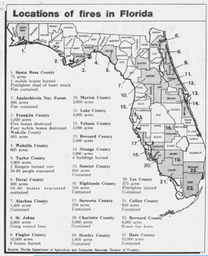 While people in the cities were coping with the challenges of no electricity, an eruption of “lightning-caused” wildfires popped up in rural areas all over the state from the Panhandle to the Keys. The vast majority of these were small. Some became major fires driven by “very erratic winds,” gusting up to 42 and 60 mph. The worst threat in the state came along a 100-mile stretch from St. Augustine to Cape Canaveral, where seven or eight fires were forcing mass evacuations. The map below shows the counties where fires occurred: