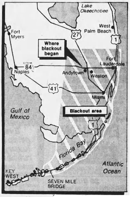 The blackout affected 4.5 million residents living in Miami, Fort Lauderdale, Boca Raton, Delray Beach, Boynton Beach, and various other cities. Newspapers were full of stories of motorists stuck in traffic jams, women delivering babies in darkened hospitals, and people stranded in elevators. The power outage ran from Royal Palm Beach in Palm Beach County all the way south to the city of Marathon located in the Keys, a distance of 180 miles.