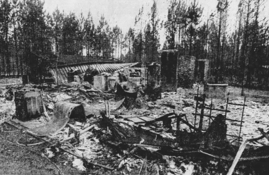An expensive home in Pine Lakes subdivision of Palm Coast is reduced to rubble. Note the unburned foliage of nearby trees.
